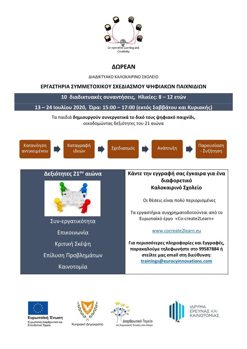Εγγραφείτε έγκαιρα για ένα διαφορετικό καλοκαιρινό σχολείο! Για περισσότερες πληροφορίες και εγγραφές, επικοινωνήστε μαζί μας είτε στο 99587884, είτε μεσω e-mail στο trainings@eurocyinnovations.com, είτε απευθείας στη σελίδα μας στο Facebook.